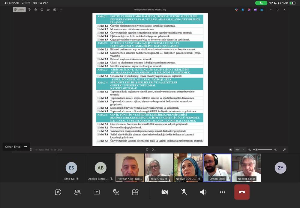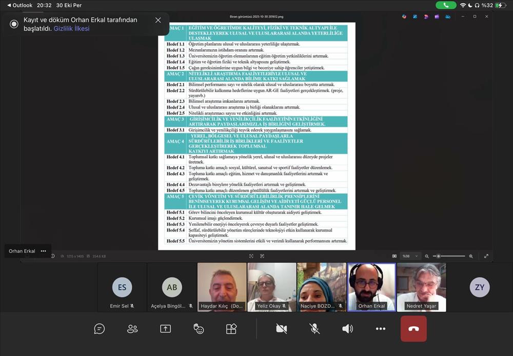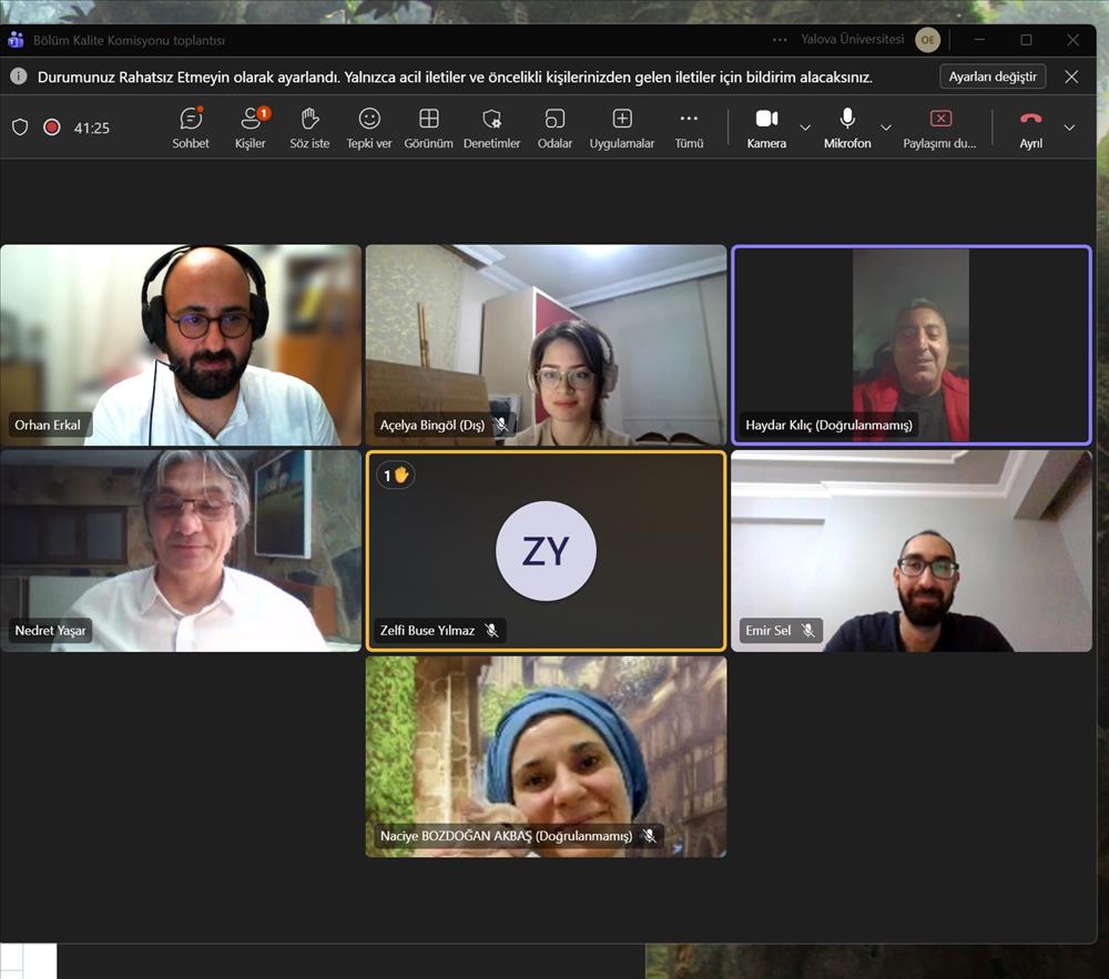 Resim Bölümü Kalite Komisyonu 30.10.2025 tarihinde Bölüm Kalite Komisyonu Başkanı Prof. Dr. Nedret Yaşar, Bölüm Kalite Koordinatörü Doç. Dr. Orhan Erkal, Eğitim ve Öğretim Bölüm Koordinatörü Dr. Öğr. Üyesi Naciye Bozdoğan Aktaş, Ar-GE Bölüm Koordinatörü Prof. Dr. Yeliz Okay, Sürdürülebilirlik Bölüm Koordinatörü Arş. Gör. Emir Sel, Bölüm Araştırma Görevlisi Zelfi Buse Yılmaz, Bölüm Öğrenci Temsilcisi Açelya Bingöl ve Bölüm Danışma Kurulu Üyesi Yalova Güzel Sanatlar Lisesi Okul Müdürü Haydar Kılıç’ın katılımıyla Microsoft Teams Platformu Üzerinden Gerçekleştirildi. Toplantıda Resim Bölümü ve Üniversitemizin kalite faaliyetleri Gerçekleşme düzeyleri ve iyileştirme faaliyetleri hakkında bilgilendirme yapıldı. Öğrenci temsilcimiz Açelya Bingöl ve danışma kurul üyemiz Haydar Kılıç Bölümümüz kalite sürecine dair önerilerde bulundular.